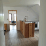 Wohnzimmer mit Offenküche: großes Sofa mit Schlaffunktion, Sessel für groß und klein, Esstafel für Freunde