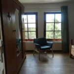 Schlafzimmer: gemütliches 180 x 200 cm Bett, Nachttische, Kleiderschrank, bodenlange Vorhänge mit Verdunklungsfunktion, Sessel