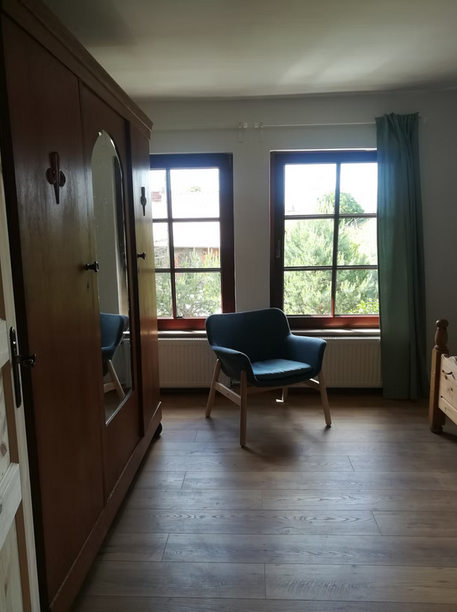 Schlafzimmer: gemütliches 180 x 200 cm Bett, Nachttische, Kleiderschrank, bodenlange Vorhänge mit Verdunklungsfunktion, Sessel